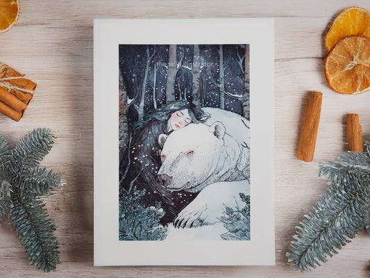 Winter Dreams Art Print - Woman with Polar Bear Totem in Snowy Forest