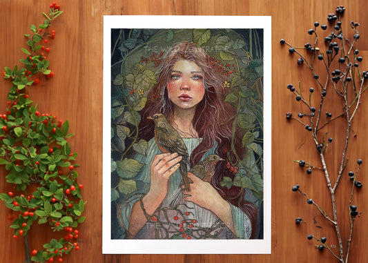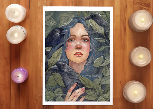 The Nest III Art Print – Enchanted Woman with Ravens, Mystical Nature-Inspired Wall Art