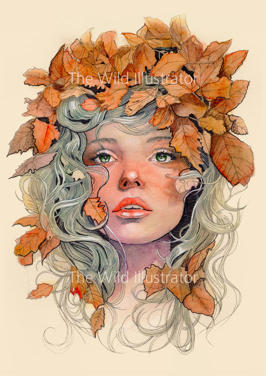 Whispers of Fall Art Print – Autumn Leaves Woman, Magical Fall Decor, Seasonal Wall Art