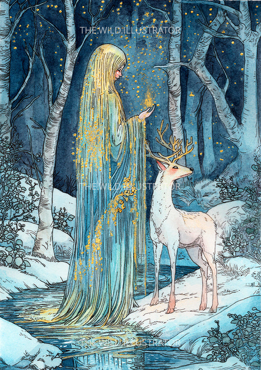 The Solstice Spirit - Mystical Winter Art Print | Nature-Inspired Decor | Hand-Embellished with Gold