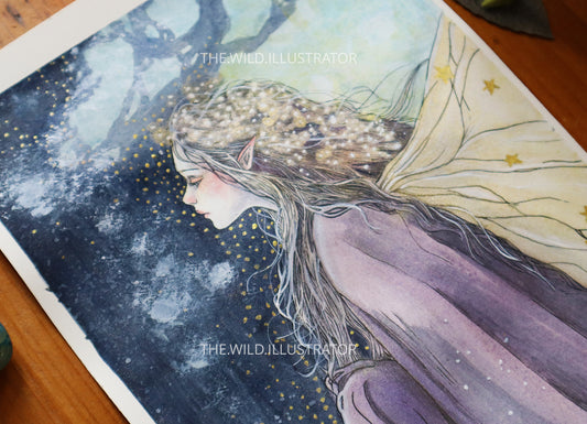 Keeper of Winter’s Glow – Original Fairy Watercolor Painting with Golden Details, Dark Fantasy Illustration
