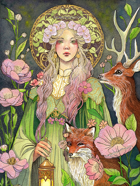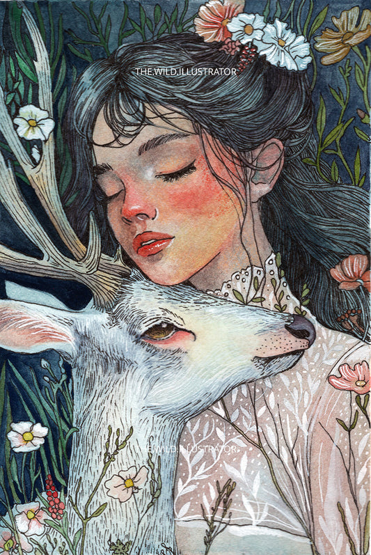 Sacred Bond – Original Watercolor Mini-Painting of a Woman and White Deer
