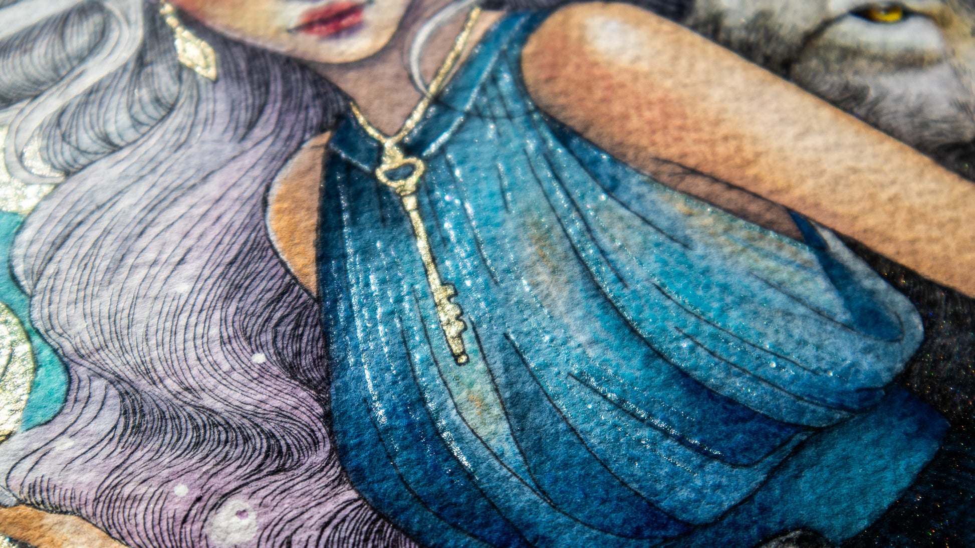 Painted with watercolor and ink, this piece glows with metallic details that shimmer in person, bringing the moon and the flame to life.